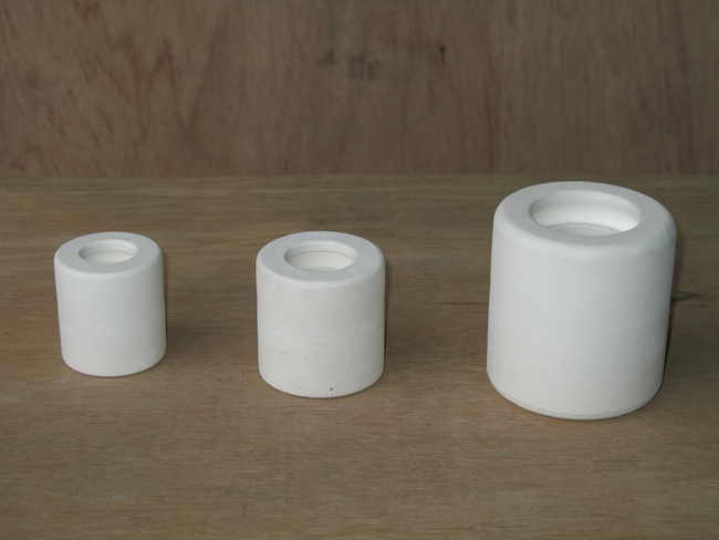 一般の磁器製バーナーヘッドは下部内側に雌ねじが切ってあり、レギュレーター部分をねじ込んで使用できるようになっています。しかし、この方法では、磁器と金属が接しているので、焼成時、膨張率の違いにより磁器製ヘッドが破損することがあります。これをさけるため、特別に「火皿」というパーツを作り組み込んでいます。